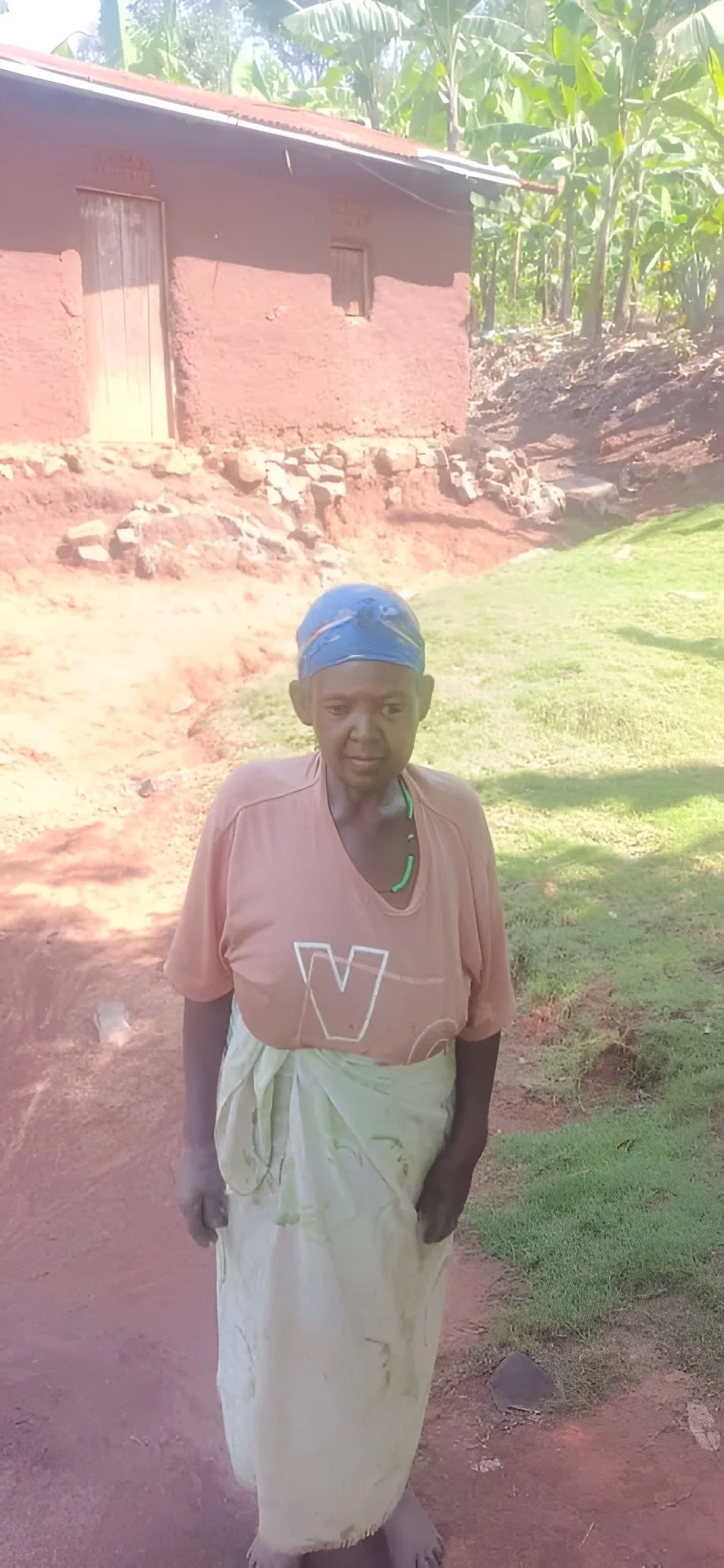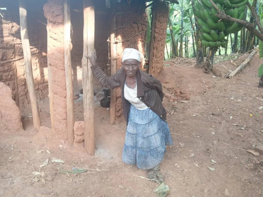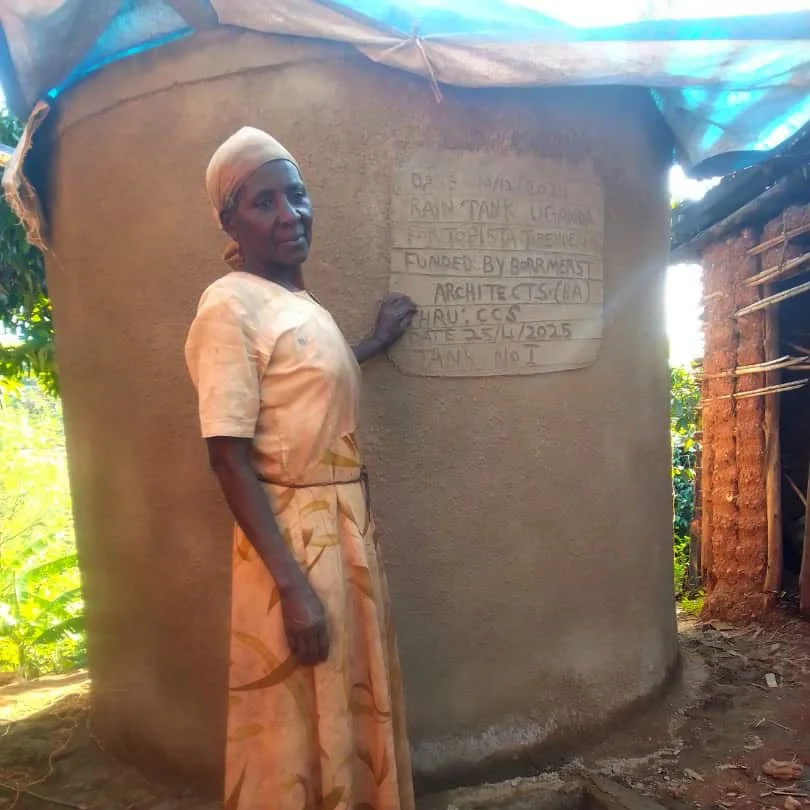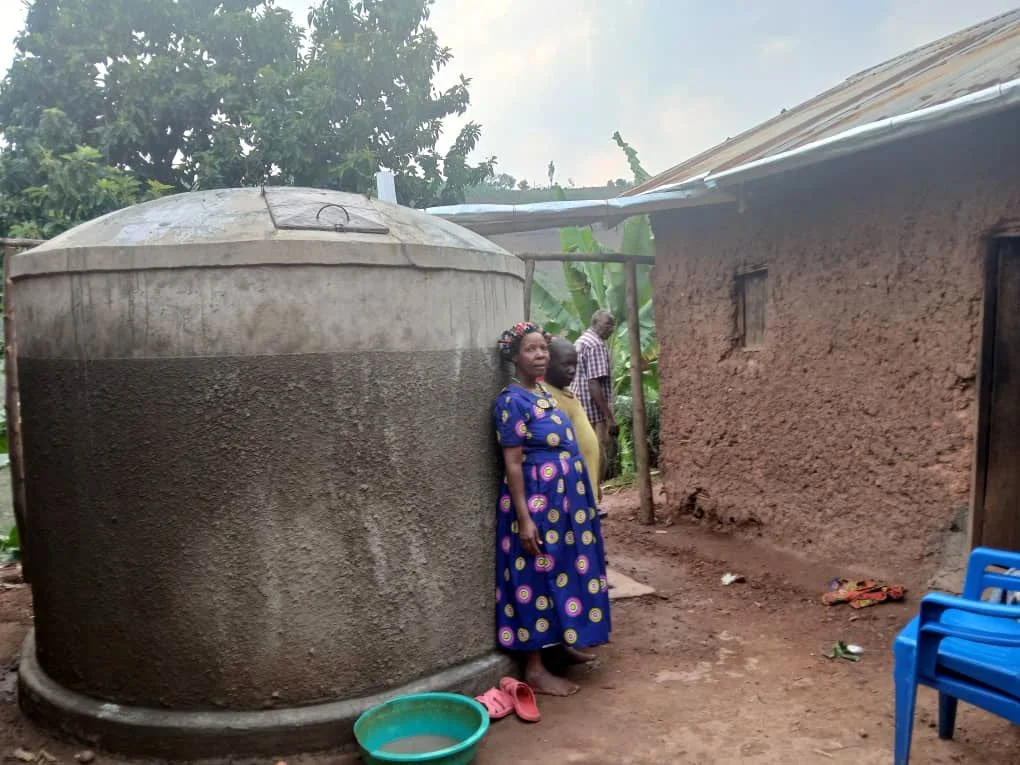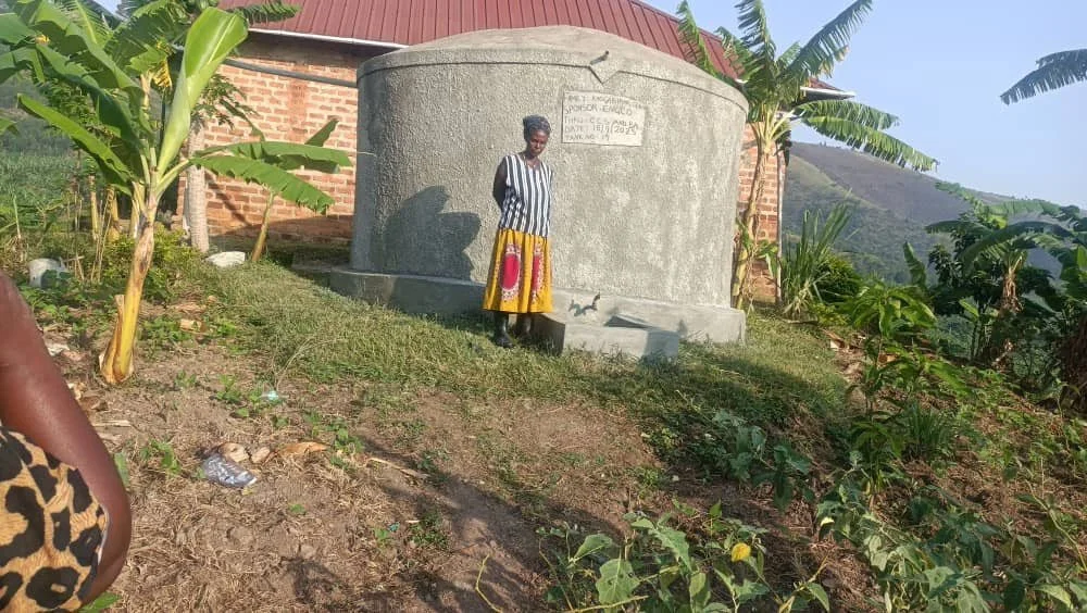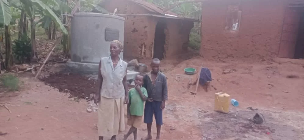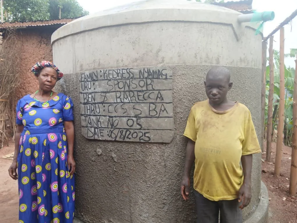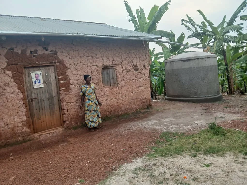 Nshekanabo still provides for six grandchildren. Daily 5 km trips to cloudy rock pools left her exhausted and her children sick. A tank at her doorstep now brings health, clean water, and dignity.