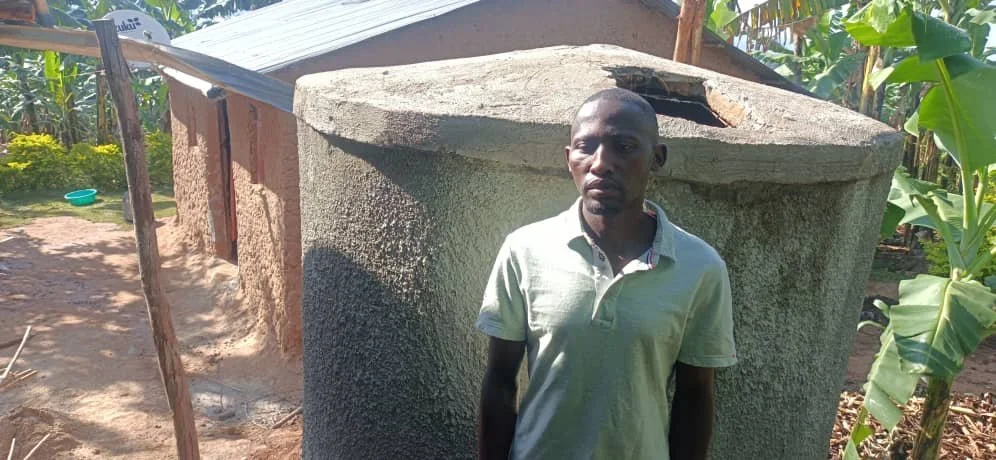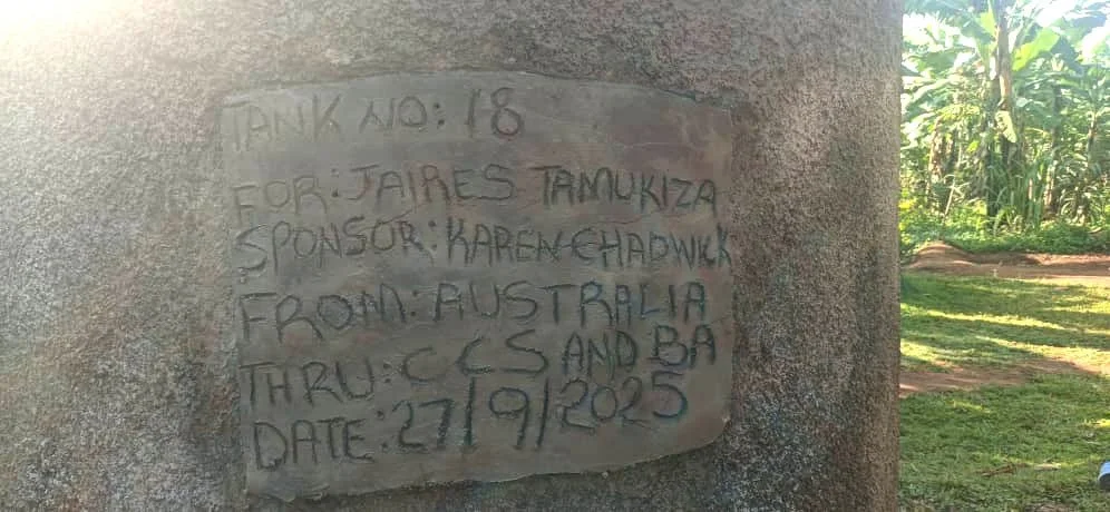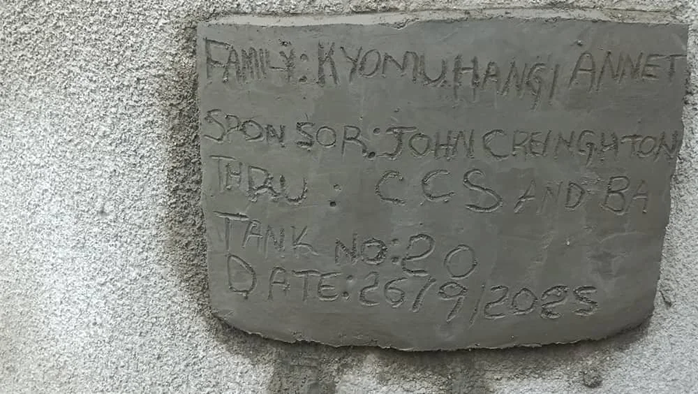 Julius, and his wife care for eight children on a dry ridge. Treks of 5 km for murky water often made the children miss school. Their rainwater tank has brought clean water, health, and energy for work and study.