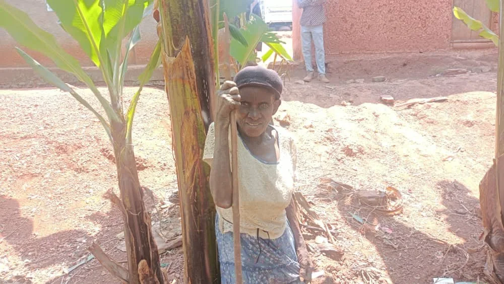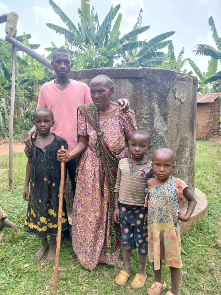 At 85, Tamukiza lost five children to illness and raised eight grandchildren while fetching water 3 km away. Safe water has restored dignity and security.